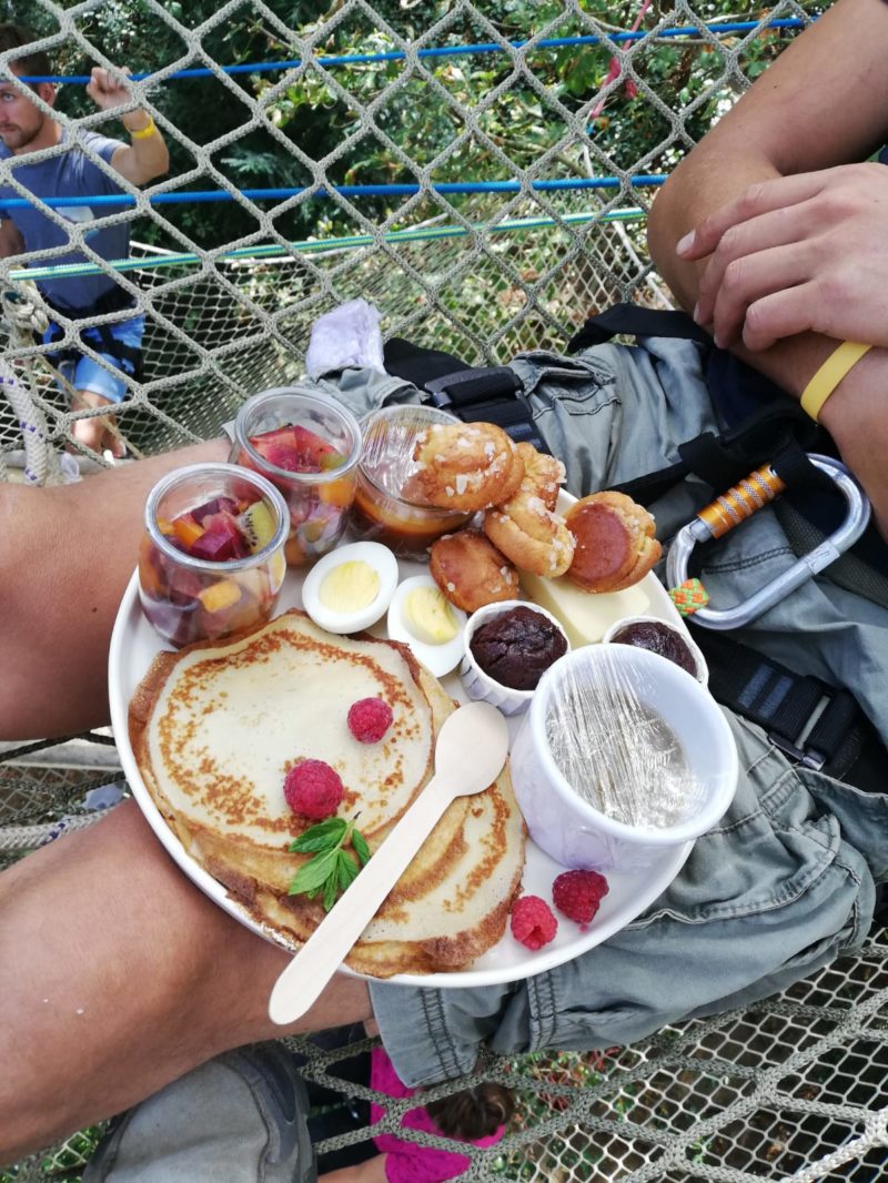 Dégustez votre brunch sur un filet, un trampoline ou toute autre structure. Les brunchs sont proposés le dimanche sur le site de la Maison de la rivière.